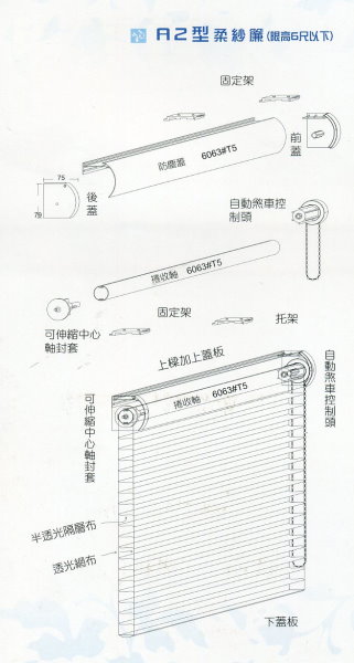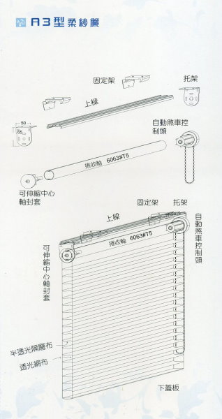 柔紗簾使用捲簾的圓管上下收放原理, 搭配橫式百葉的造型而成。兼具捲簾操控特性及百葉調光功能.使用紗質布料, 可依需求微調光線, 造型柔美典雅, 增添室內柔和氣息, 可依需求搭配電動馬達。